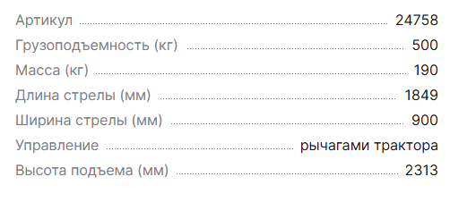 Грузоподъёмность тракторного фронтального погрузчика составляет 500 кг. Максимальный вылет стрелы превышает 1,8 метра. Обеспечивает высоту подъёма груза на 2,3 метра. КУН для трактора иностранного производства позволяет выполнять погрузочно-разгрузочные операции на ограниченной площади. Фронтальный погрузчик на трактор создан с использованием надёжного и долговечного металла, прошедшего специальную обработку для защиты от коррозии. Способен эксплуатироваться на протяжении длительного времени при своевременности обслуживания. Модель с высоким уровнем ремонтопригодности.