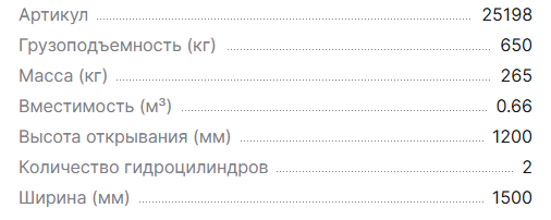 Обеспечивает подъём грузов до 650 кг. Вместимость ковша составляет 0,68м3. Ширина захвата для силоса составляет 1,5 метра. Для создания применяется прочный металла с антикоррозийным покрытием. Модель рассчитана на продолжительное и интенсивное использование.