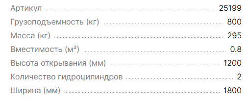 Обеспечивает подъём грузов до 800 кг. Вместимость ковша составляет 0,8м3. Ширина захвата для силоса составляет 1,8 метра. Установлены сменные зубья, устойчивые к механическому повреждению. Сплошная задняя стенка усилена специальными центральными ребрами.