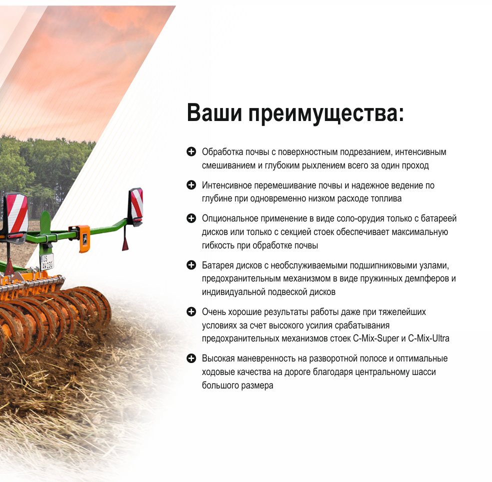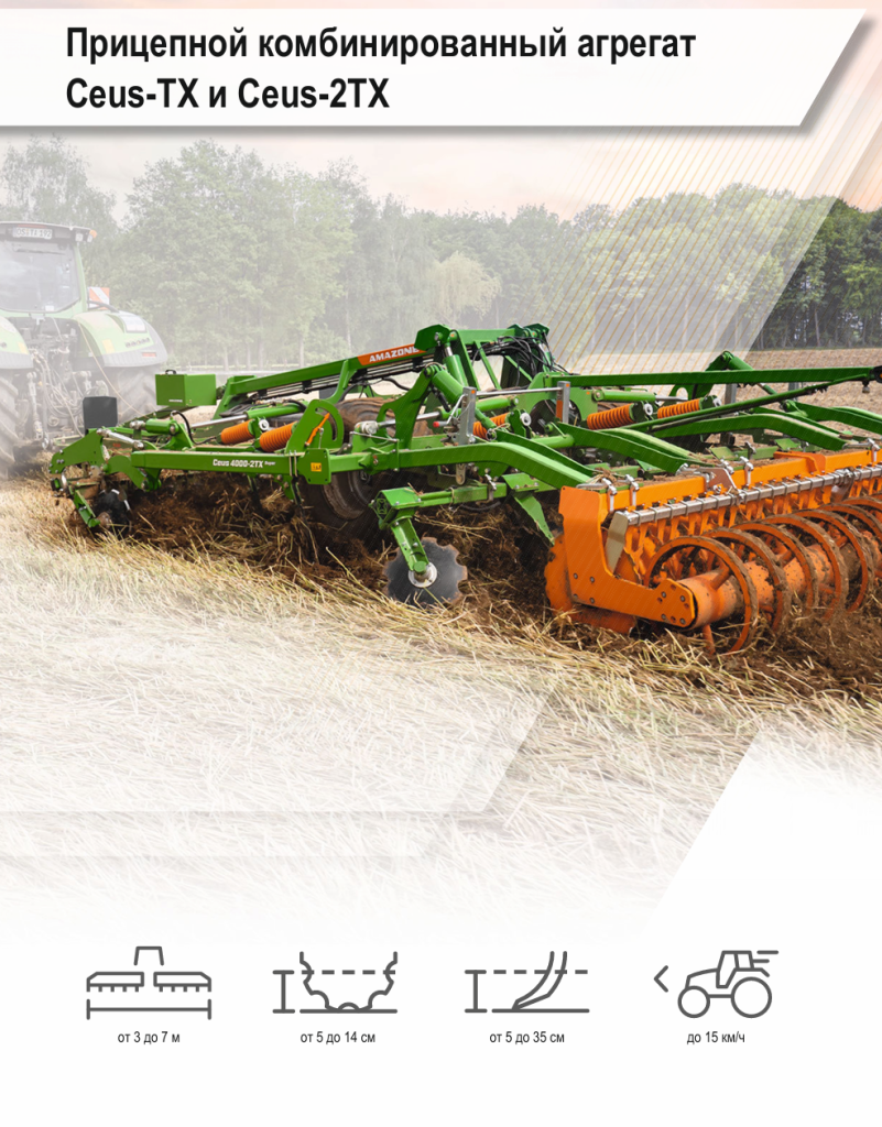 Прицепной комбинированный агрегат Ceus с шириной захвата от 3 м до 7 м подходит, прежде всего, для глубокого рыхления почв, на которых, однако, одновременно нужно провести заделку большого количества органической массы на минимальную глубину. За счет комбинации батареи дисков и секции стоек Ceus объединяет преимущества дисковых борон и культиваторов в одной компактной машине. Ceus можно преимущественно использовать для обработки стерни, а также для основной обработки почвы, глубокого рыхления и предпосевной подготовки.