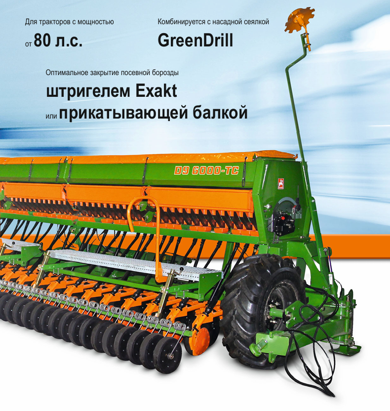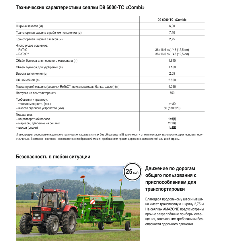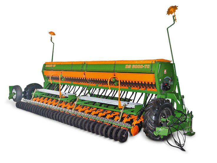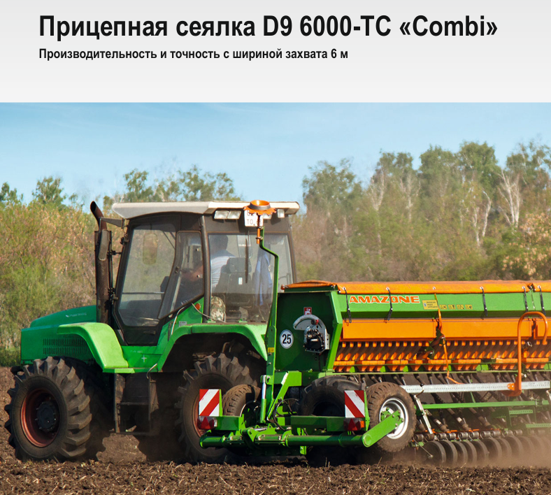 Прицепная сеялка D9 6000-TC „Combi“ идеально подходит для прецизионного традиционного и мульчированного посева зерновых, бобовых, а также трав. За счет низкой тяговой потребности и компактности при ширине захвата 6 м она отличается высокой действенностью и идеально подходит для сравнительно маленьких тракторов с низкой подъёмной силой. Объём бункера 2.800 л для удобрений и посевного материала и рабочая скорость 15 км/ч гарантируют высокую производительность.