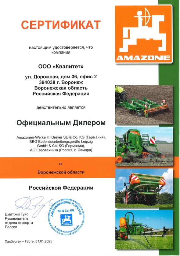 Компания «КВАЛИТЕТ» является официальным представителем ведущего производителя сельскохозяйственных орудий в области почвообработки, посева, внесения удобрений и защиты растений Amazone и поставщиком одного из крупнейших мировых производителей погрузчиков Manitou.